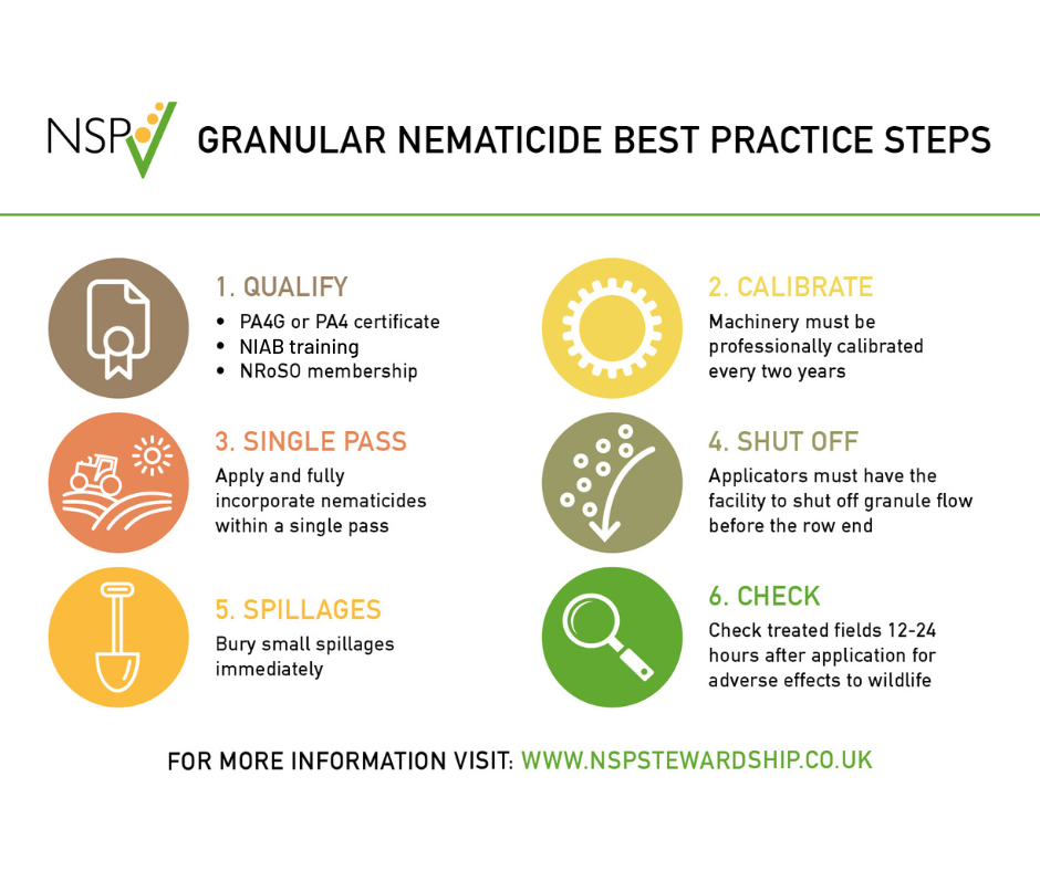 The Nematicide Stewardship Programme (NSP) promotes the correct use of granular nematicides. The NSP best practice steps, which are part of the Red Tractor standards for potato growers, give guidance on how to achieve safe and responsible application.